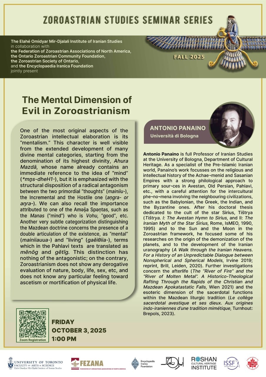 Professor Antonio Panaino, Full Professor at the University of Bologna and one of the most renowned scholars in the field of Zoroastrian studies and Avestan-Pahlavi literature, will deliver a lecture today, October 3, 2025, at 1:00 p.m. as part of the Zoroastrian Studies Seminar Series organized by the Elahé Omidyar Mir-Djalali Institute of Iranian Studies at the University of Toronto.